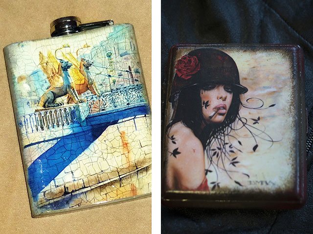 - Flasks, cigarette cases and other items made in the style of decoupage.