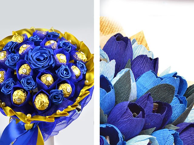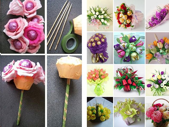 In order not to be commonplace and not just put the candies in a bag, you can make flowers from them, which you can then collect in a bouquet in an original and beautiful way.