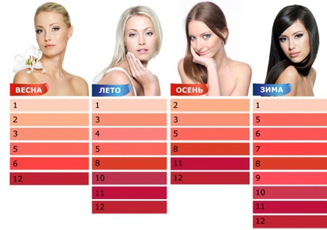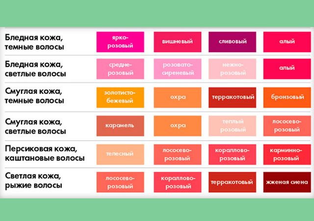 As already noted, it is very important to pay attention not only to the hair, but also to the eyes. For example, girls with brown eyes are suitable for orange, coral, cherry and dark pink palette. For girls with blue eyes and fair skin, a gentle warm palette is suitable.
