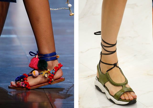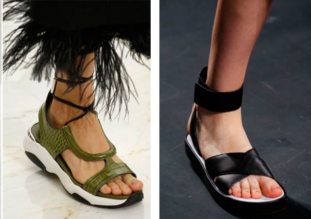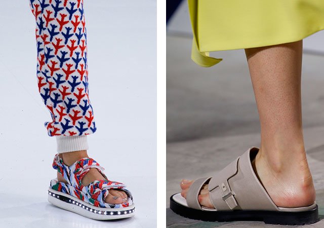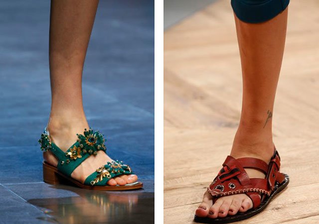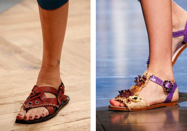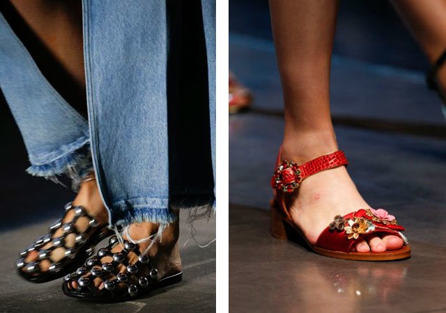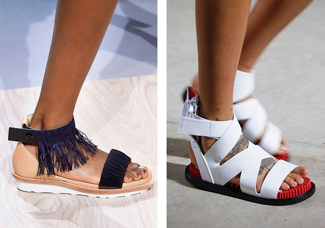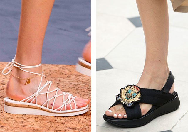 The good news is that the designers not only tried to realize their most daring and extraordinary ideas, but also took care of the comfort of our legs. On the catwalks are presented as classic models, complemented by jewelry in the form of buckles, laces, thin straps, as well as comfortable models with stable heels and wedges, combining comfort and unusual decor. Fashionable sandals with a clasp are decorated with floral applique, ruffles, rivets, perforation and small bows. Such decorative elements are also to the liking of little fashionistas that fashionable couturiers have not forgotten about.