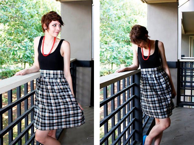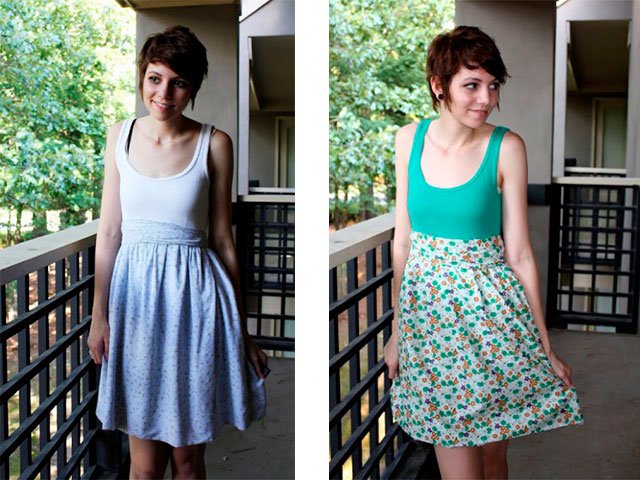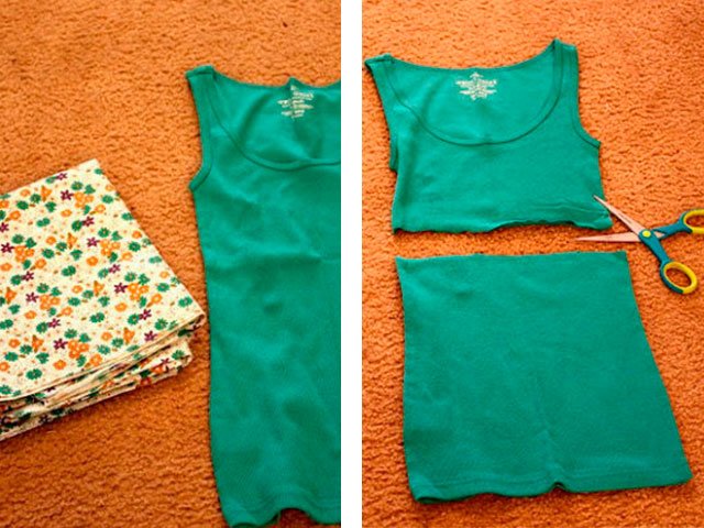 Take old t-shirt and skirtor piece a wall over a house. They have to fit together. Top is better to choose knitted, and the skirt should be lighter. You will make such a model in less than an hour.