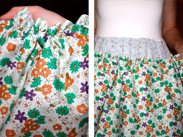 5. If you want not a straight skirt, but pleated, then cut the pattern into two parts. Sew the bottom of the assembly. Can add petticoat different color. And sheathe all the edges with a ribbon in the color of a petticoat.