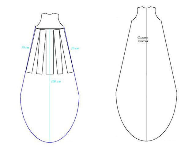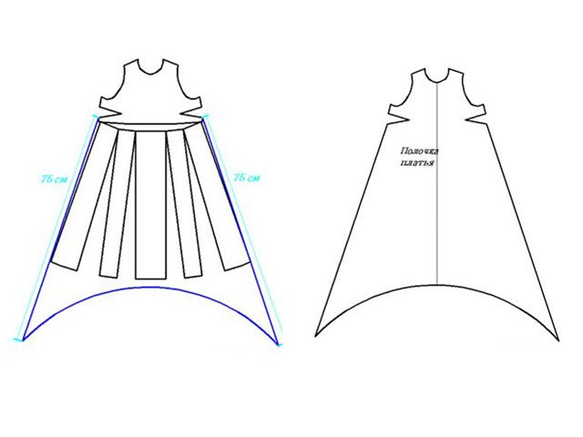 Make a trapezoidal flare from the line of the armhole on the back of the dress, making the cutout of the skirt. Mark in the middle of the back the length of the skirt, for example, 115 centimeters, and round the hem to the side seams.