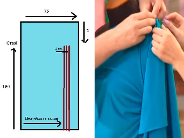 Take a piece of knit fabric with viscose - a square with a side of 150 centimeters. Next you need to fold it in half and take off hips and breast. At the bottom of the material, measure the semi-girth of a larger measure. Then you need draw a line upbut to the edge do not reach 25 centimeters.