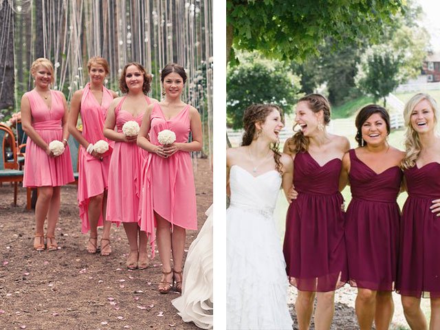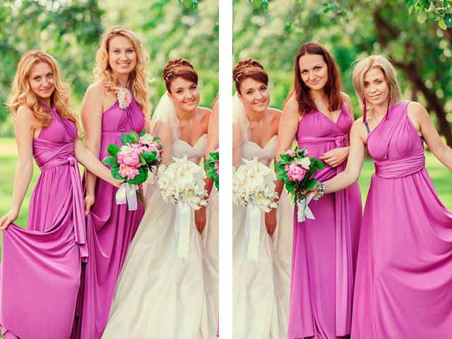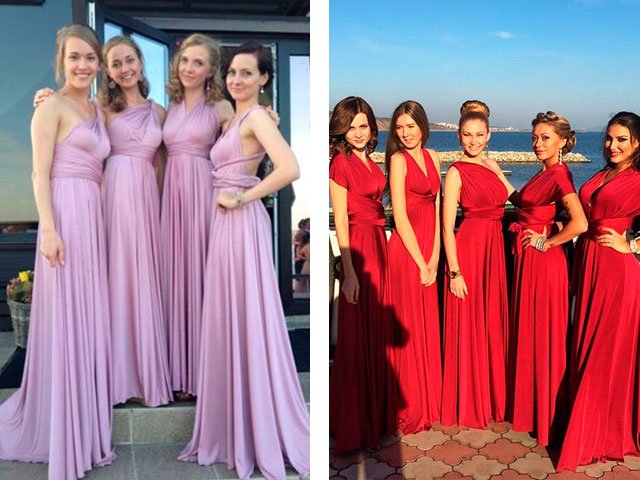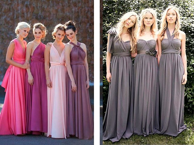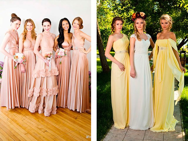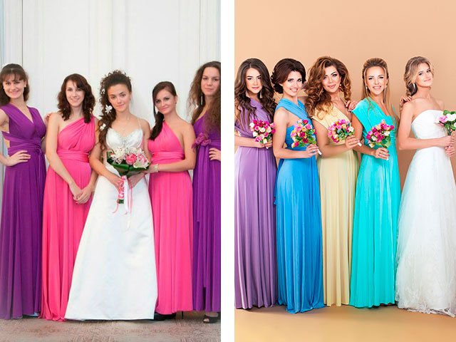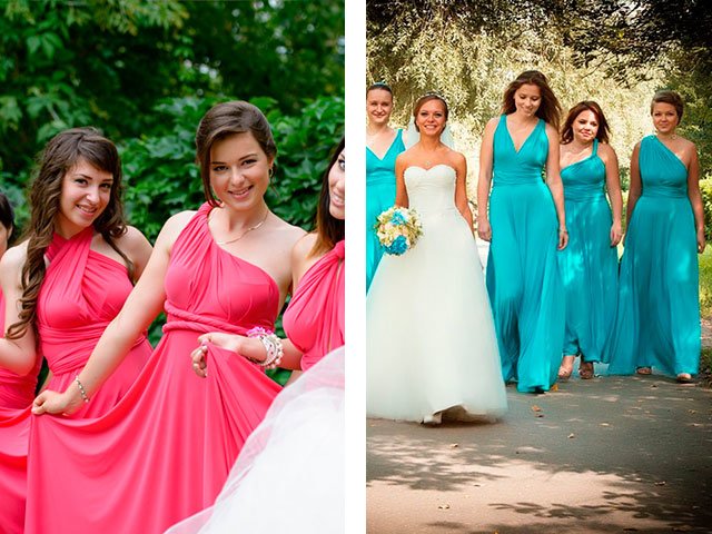 Such a unique invention of designers as a transformer dress stands out favorably. Each girl can show her individuality, remaining in harmony with everyone else. This style like no other gives such an opportunity. In addition, even during one evening, each guest can repeatedly change their outfit. Here is a game with length and a change in the texture of the bodice and much more. Even if one color scheme is used, girls play it differently and look very impressive.