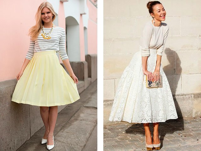 Here you also need to choose the correct length - either midi or maxi. So you will look perfect. You can combine with feminine blouses. Skirts of this kind look very good in the summer - they make the image easier. The main thing - not in a horizontal strip, not plain and without a large pattern - this makes the image heavier.