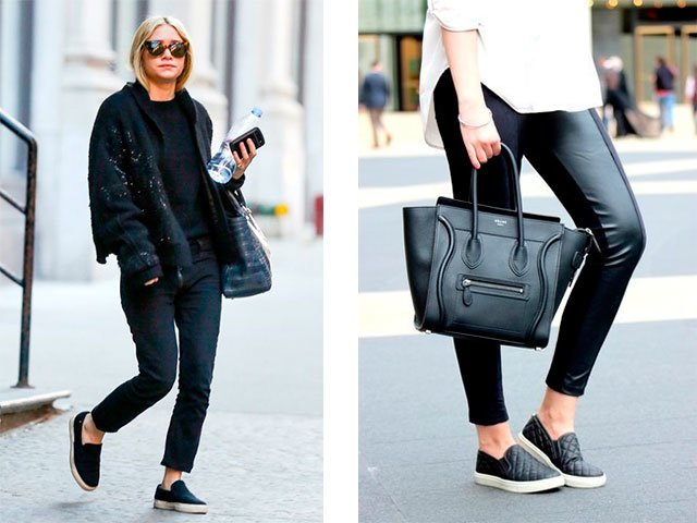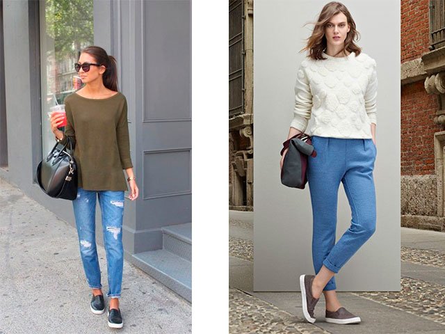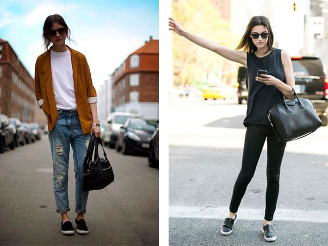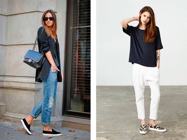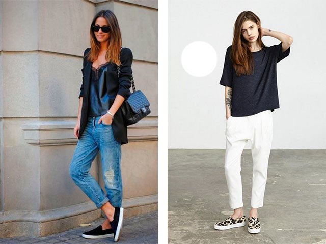 - Try to wear boyfriend jeans or any pants with the slip-ons, but be sure that they are not classic. Color can be black, blue or white.