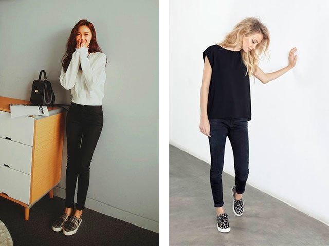 6. If you want to look beautiful and stylish in the office, then feel free to choose a black loose t-shirt and the same black skinny jeans. And the shoes are black and white printed slip-on sneakers.