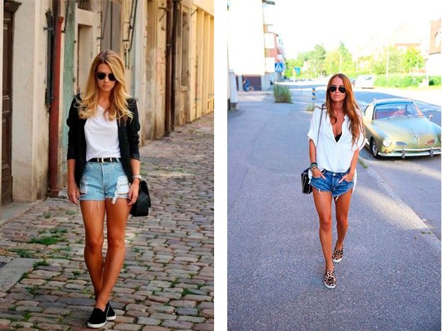 8. A more open version combines a white blouse with a large neckline. Blue or blue denim shorts, glasses, a bag over your shoulder, and the highlight of your image is leopard slip-ons! A bow can be supplemented with various accessories: earrings, rings or bracelets. It is desirable that they be summer and bright.