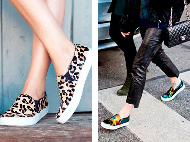 This year, very popular are not ordinary slip-ons, but models with high soles or varnished pairs. Moreover, the color scheme of such shoes is very diverse: black, red, beige, silver, striped, blue, shiny, blue, with a floral print, leopard prints, even with laces. Therefore, do not worry if you cannot choose the right shoes for yourself - there is a pair for every taste. Rhinestones are considered fashionable. And universal and for any weather - black - they can be worn both in summer and in winter.
