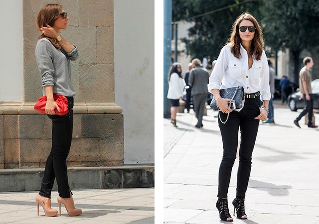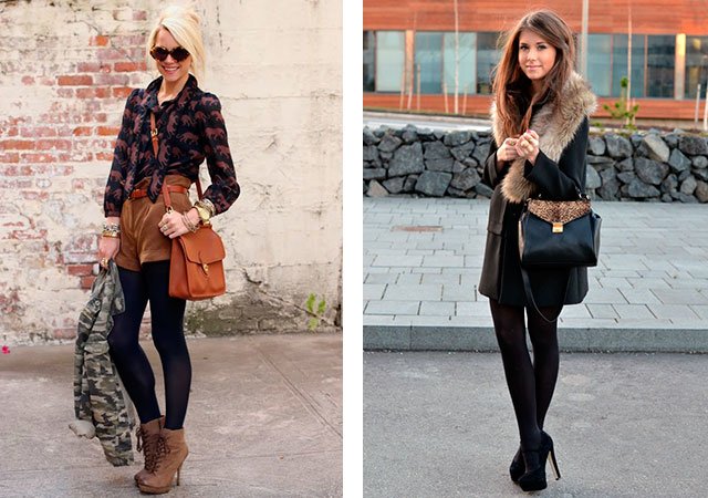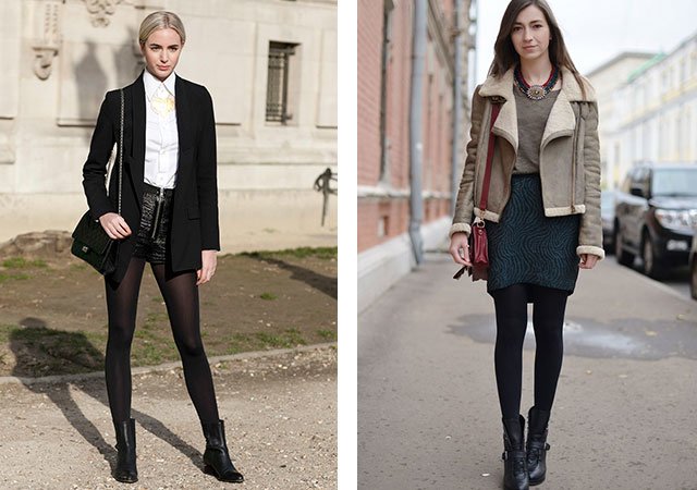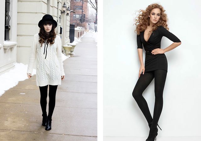 Black tights are perfect for the image, if you choose a black dress or skirt. Also, this color of tights will look good and lengthen your legs if you wear black stilettos with them.