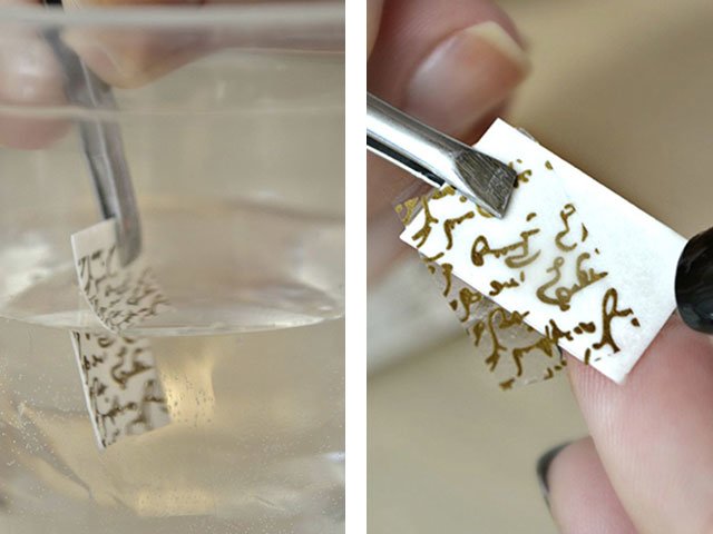 The slider looks like a small piece of thick paper that needs to be moistened in water and attached to the nail, after fixing with a transparent gel varnish or top. A special composition for fixing the patterns is not needed.