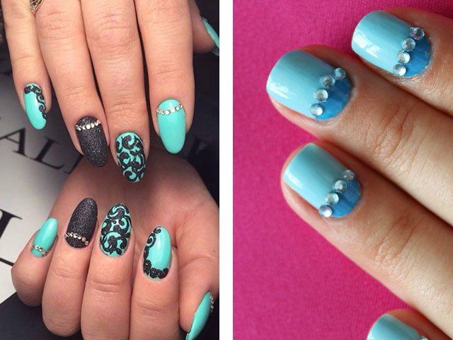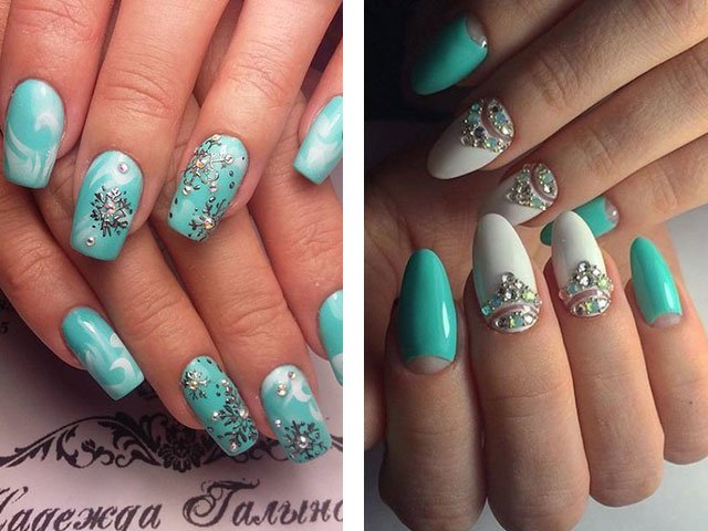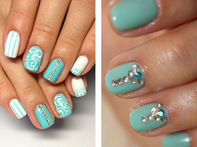 The jacket also looks great in combination with turquoise, pink and white. In festive variations, it is appropriate to separate it from white / pink / cream and other shades with small rhinestones. This will make the overall image more vibrant and festive. This will look more appropriate if the accessory and / or dress has a similar decoration. At the same time, the turquoise color itself does not have to be applied to the main part of the nail - its location can be chosen at your discretion (masters say that it looks good in the upper part of the nail). This option makes the image feminine and stylish.