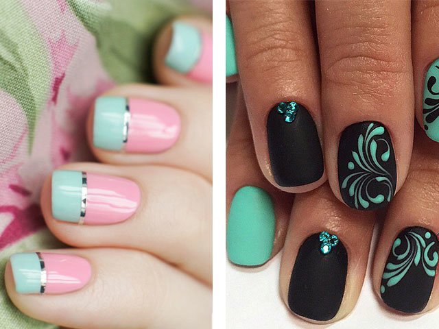 It can be plain, dull or multi-color, simple or with a pattern, with the effect of broken glass or with rhinestones / stones, etc. When choosing a design, remember the main rule - the shade should fit the overall style of clothing, complement it, and not be distracting and require special attention. The whole palette and variation of combinations are visible in the photo.