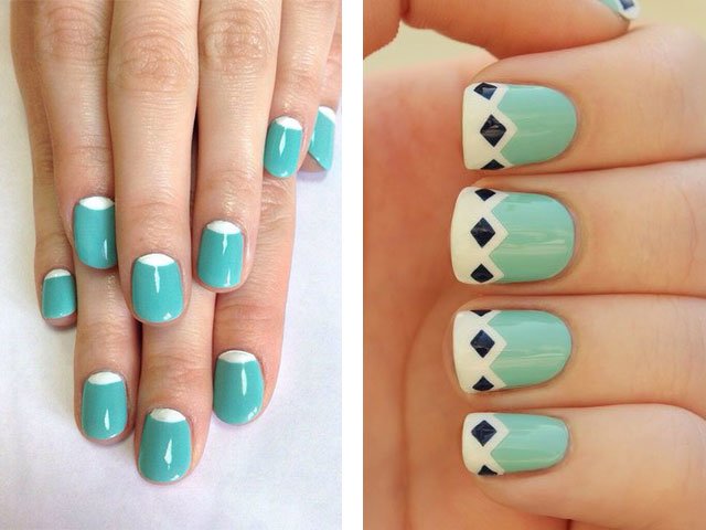 A combination of turquoise with white, yellow, pink, black, beige gel polish