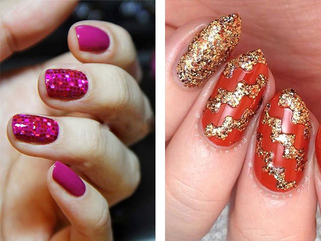 1. Covering the nail with sparkles completely. As a rule, for the most part of the hand, the nails are covered with a single-color varnish, and on one or two fingers, sequins.