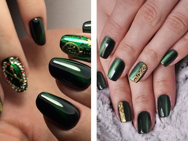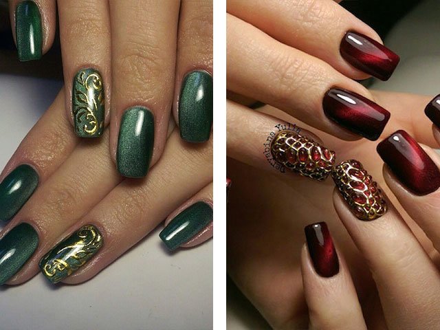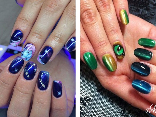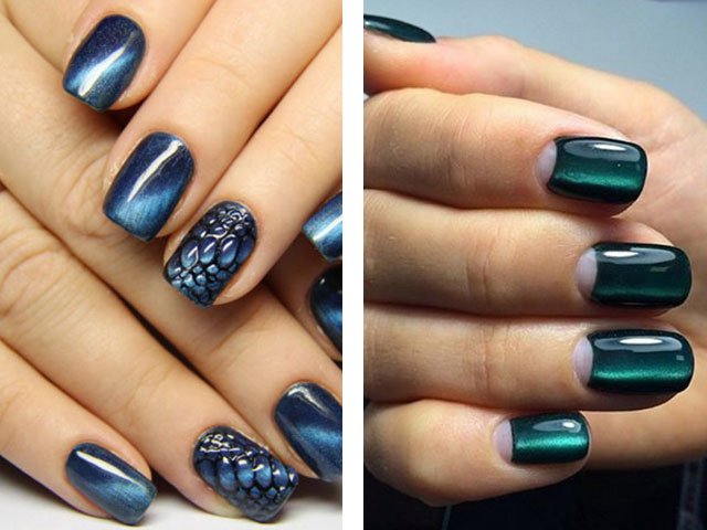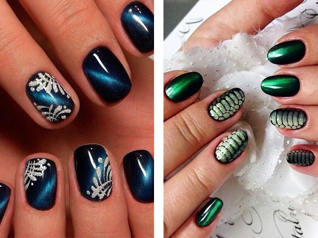 Unique magnetic varnish opens up space for creativity and imagination of designers. You can not only create the effect of radiance and glare with a magnet, but also apply drawings to the surface of the nail. These can be chaotic lines that add even more similarity to a stone, and a more professional line drawing allows you to get reptile skin effect on the surface of the nail plate.