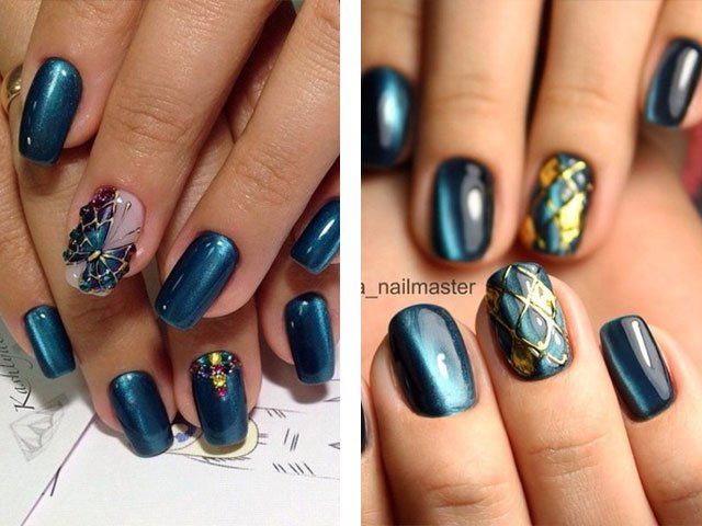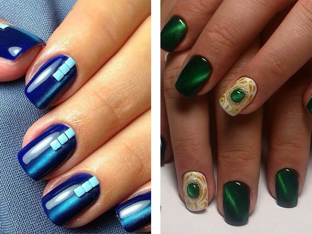 The shining coating on short nails looks especially stylish and spectacular. The color scheme of gel polish resembles a natural stone. The design uses rich, deep colors and shades: blue, green, dark olive, purple, burgundy, brown, dark red.