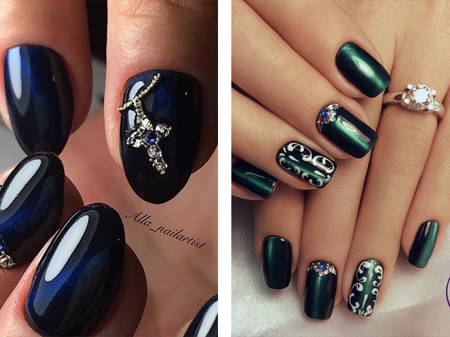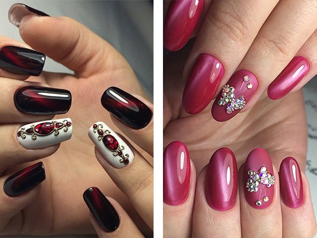 Lunar manicure is popular when the hole in the nail plate is coated with transparent varnish, and the transition is decorated with rhinestones or sparkles. Rhinestones remain at the peak of popularity and are widely used in cat eye designs. Such a bright, catchy design is appropriate for parties and special occasions. The actual creation of contrast between gloss and matte surface.