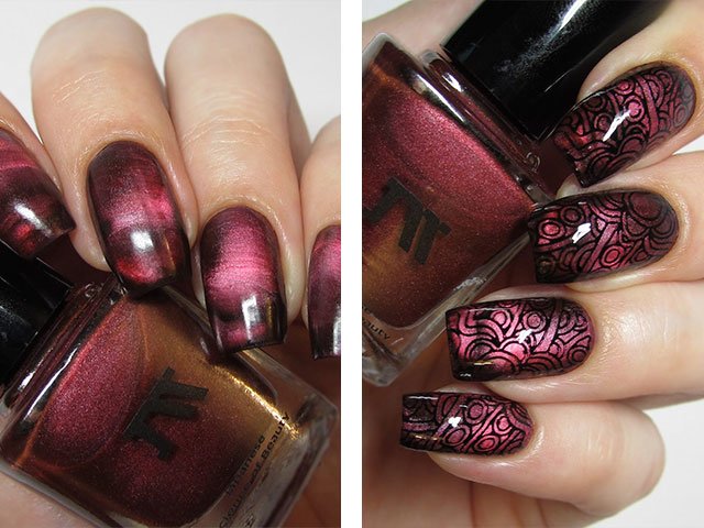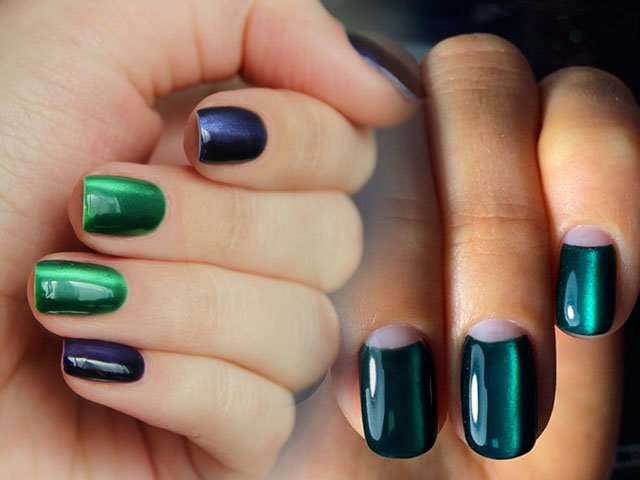 The effect of radiance on the nails is created through the use of magnetic varnish containing tiny metal particles. When a special magnet acts on the nail covered by it, these particles create three-dimensional patterns that look simply gorgeous. It is the choice of the magnet that determines which light emitting pattern you want to receive. It can be: strip, wave, stars, zigzags.
