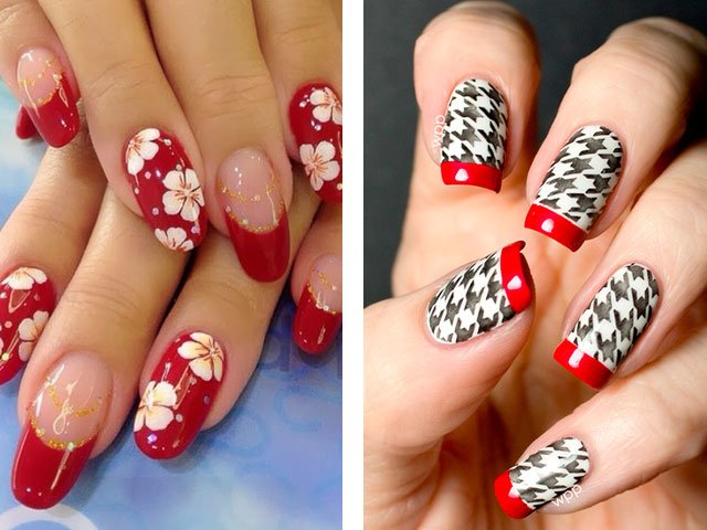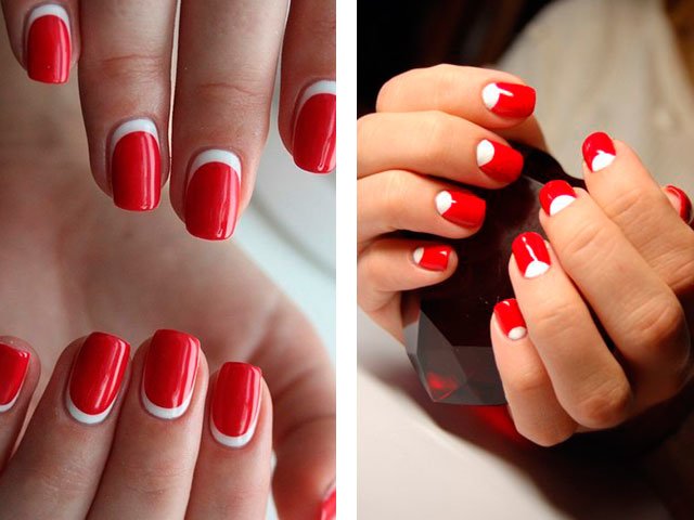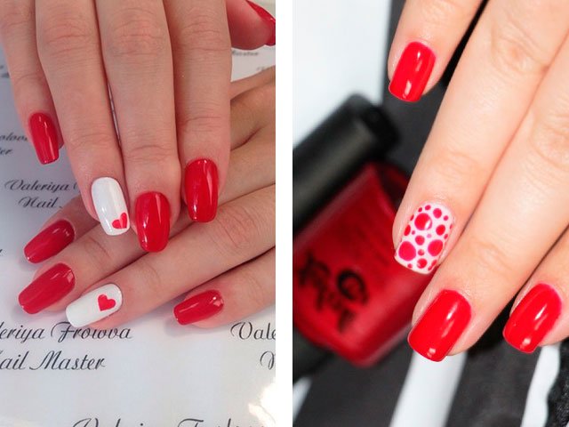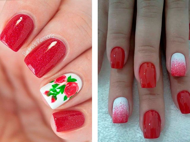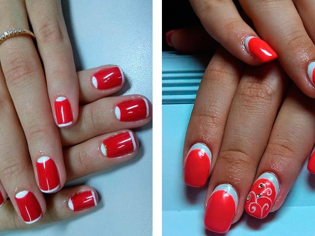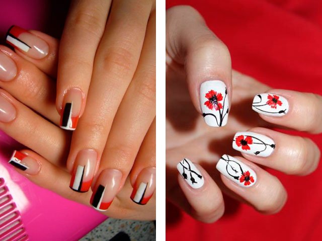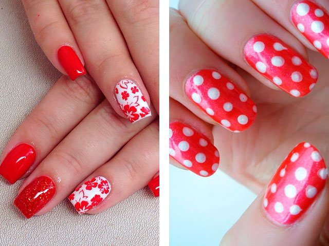 In their combination, these shades are absolutely unique. You can create a delicate design by adding just a couple of white stripes, spots or flowers. White can also be used as the main color, but it is the bright base that creates the greater effect. Many masters simply paint all their nails in scarlet, drawing only on the ring finger.