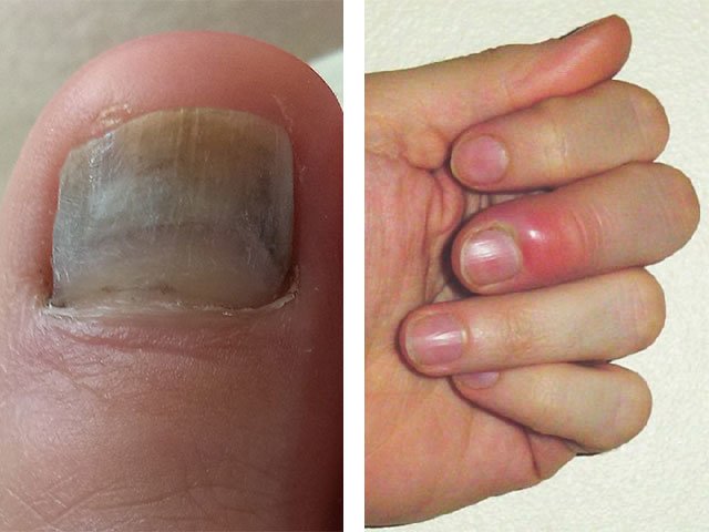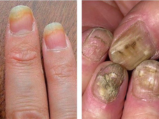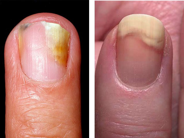 - The nail changes its natural color and luster, becomes dull white or tan.