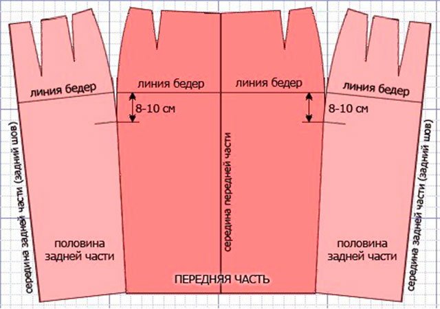 The fabric is folded with its face inward. Measurements are taken (waist and hips). A quarter of the thigh circumference is laid off from the fold line. From the top - the desired length of the skirt. 20 cm are measured from the waistline and another line is drawn. It turns out the height of the hips.