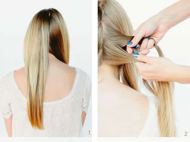 1. Divide the hair with a longitudinal parting into two equal parts and make ponytails from them.