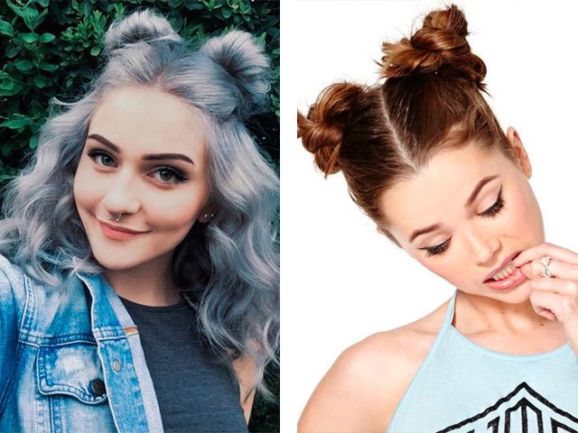This unusual model also has two options: can be done high, in the middle, or at the bottom of the head. To create a hairstyle, divide the curls in half (the asymmetric separation (by zipper) looks original), make the ponytails with an elastic band on each separated strand and create a unique design of the chosen model (babette or cool elongated horns, for example). A sloppy option is great.