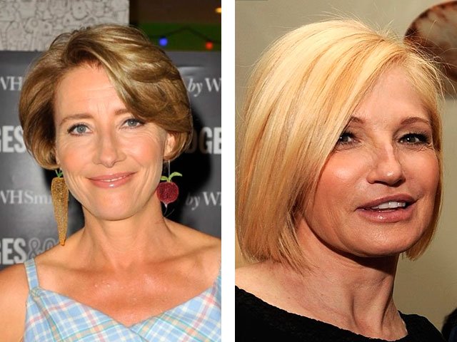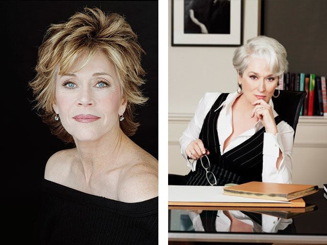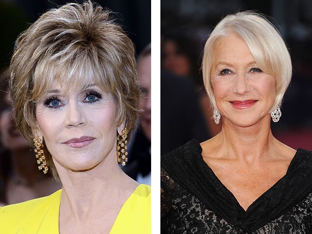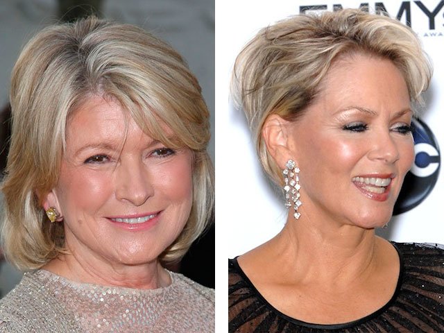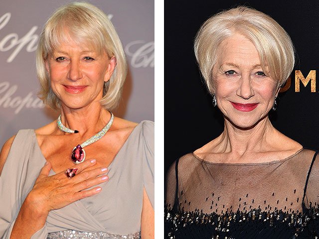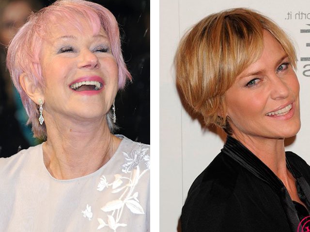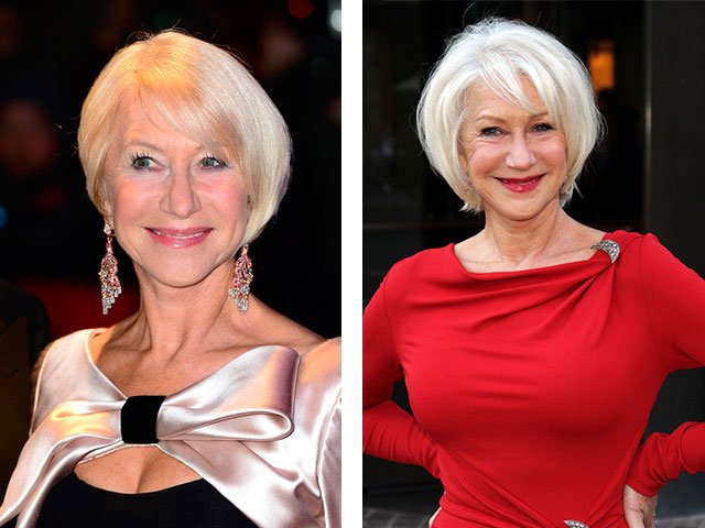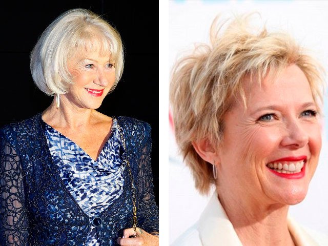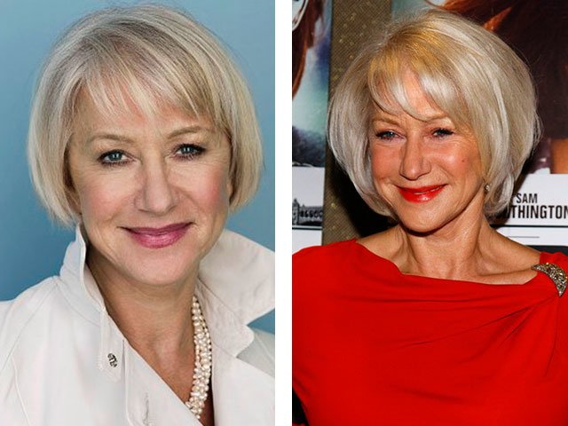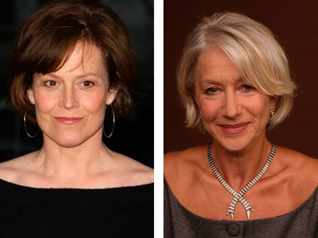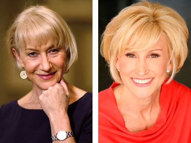 A shortened square with a rare bang that falls to one side is a hit of all time. This hairstyle fits almost any face shape, beautifully framing it and hiding wrinkles where necessary.