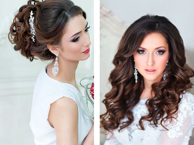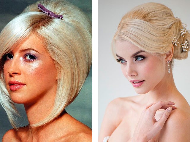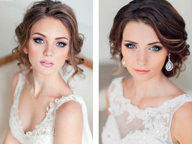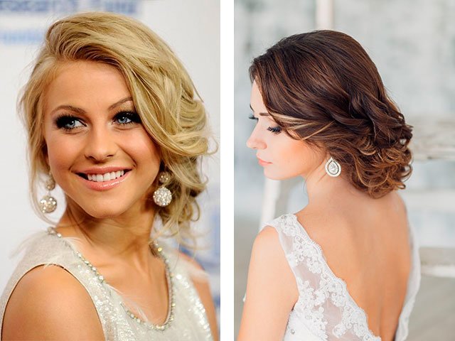 For medium lengths, asymmetry, hairpins with stones or beads, flowers or ribbons can become a highlight and a unique detail. In this case, it is worth trying to create twisted flagella around the head with a slanting bang. Laying curls on your side, gradually twist them, securing with hairpins. Turn the strands on the temples with a curling iron. Fasten the strands to the right, turning them from the face to the back of the head. Put everything together and securely fasten.