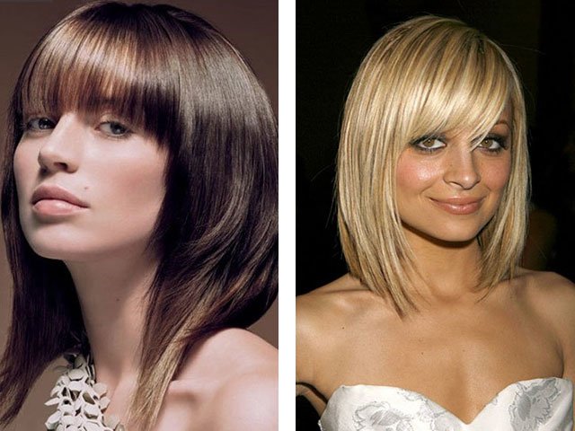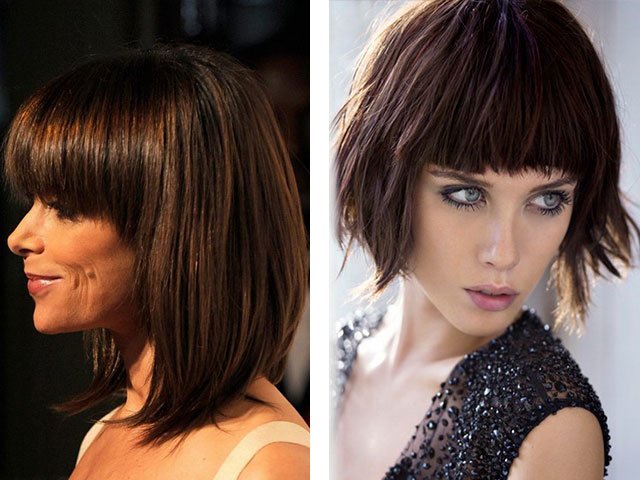 In the public domain there are photos of famous actresses, singers who wear elongated caret or bob with bangs. For example, Paris Hilton, Sharon Stone, Victoria Beckham, Katie Holmes. It is easy to care for, it can be graduated, hair styled in different ways, diversified by highlighting.