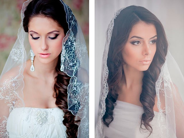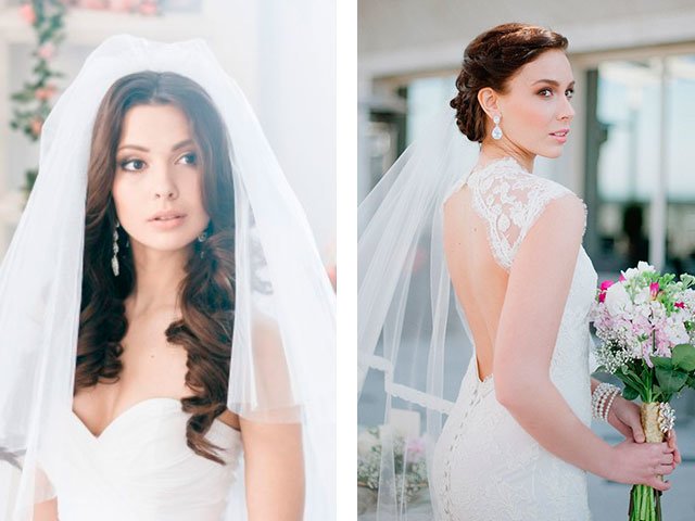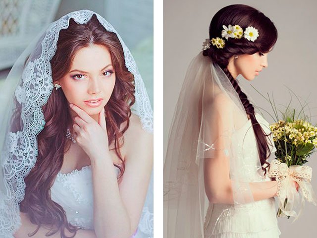 Today, a veil is not a mandatory attribute of a modern bride. You can replace it with a hat, veil or rim. But, when the celebration is sustained in the classical style, it is not worth to retreat from tradition. A veil and long hair are the perfect combination, since you can attach it like a braid. so on a bunch. And if you decide to leave the curls loose, get a pair of invisibles and fasten the veil on the crown. In this case, fishnet products with embroidery and braid should be chosen.