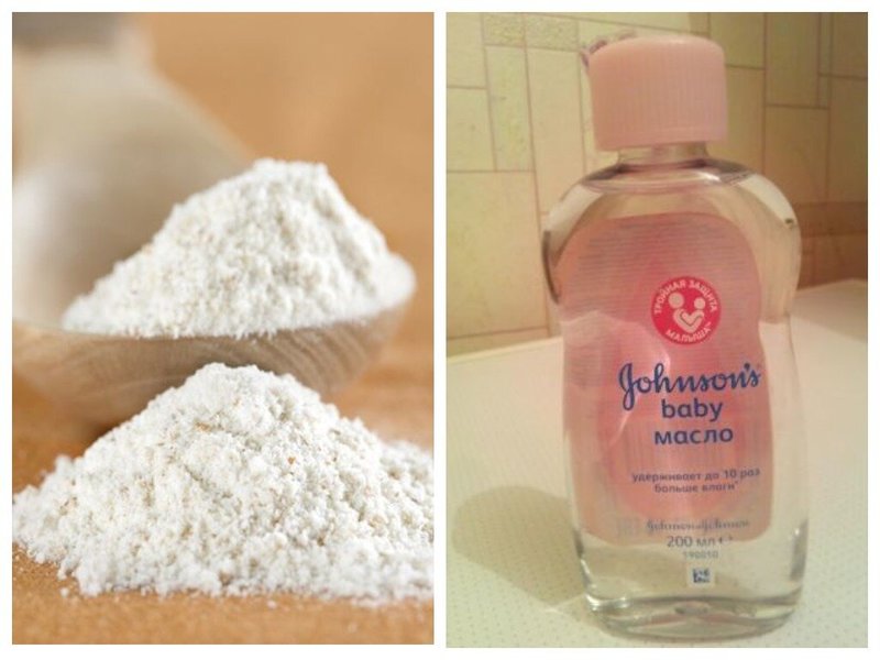 Pour the flour into a large container, for example, in a bowl, and add the baby oil in the ratio: 4 cups flour to half a standard oil bottle. Stir everything with a wooden spoon.