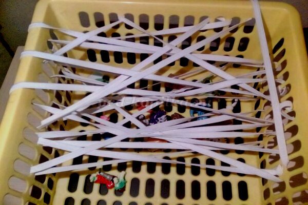 - We take an elastic band or tape and gently tie the tip to one of the holes in the basket (or any other top mount);