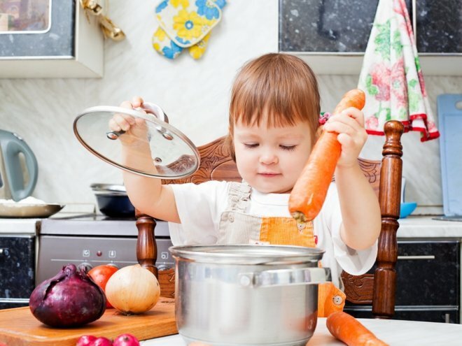 But the most important thing is provide your child with complete safety! Take away sharp objects that are necessary for cooking - replace with plastic.