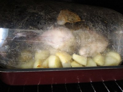 Step 4 Bake chicken in the sleeve with potatoes in the oven at t 180 degrees for 40-60 minutes.