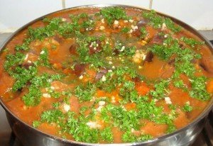 Step 4 Prepare the pouring sauce. Finely chop the onion, stew. Grated carrots on a coarse grater, finely chopped bell pepper and tomato puree mix. Then pour the eggplant and minced sauce and put the mold in the oven preheated to t 180 degrees for 30-40 minutes. Then unplug and sprinkle with parsley and garlic.