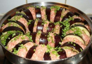Step 3 In a round form, lay out the rings of eggplant and minced meat patties alternately.
