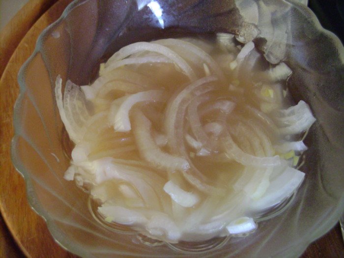Step 2 Cut the onion into thin half rings and pour 2 tablespoons. tablespoons of apple cider vinegar.