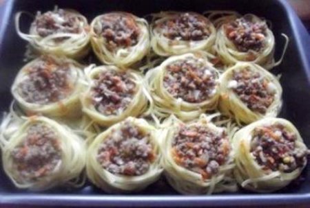 Step 4 Fill each nest with prepared meat. Pour a little water, about to the middle of the pasta and put the mold in a preheated oven to t 180 degrees for 20-30 minutes.