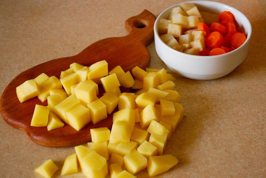 Step 4 Peel and cut the potatoes into small pieces. Cooked and cooled celery roots, carrots also cut into pieces.