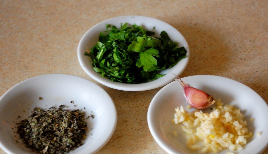 Step 8 Cut the parsley, squeeze the garlic through the garlic press. Divide marjoram into two parts - wipe one part or knead in the palm of your hand.