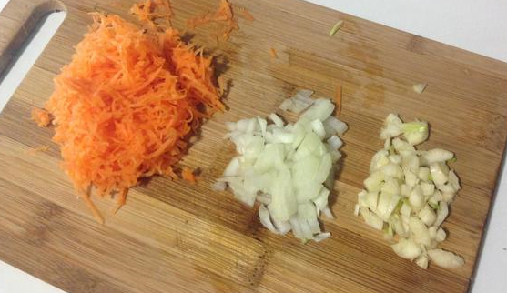 Step 3 While the meat is cooked, peel the carrots, onions, and garlic. Finely chop the onion and garlic, and grate the carrots on a coarse grater.