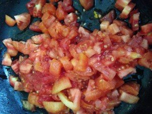 Step 5 Next, peel the tomato, finely chop, fry. Add tomato paste and simmer for 4 minutes, stirring constantly.