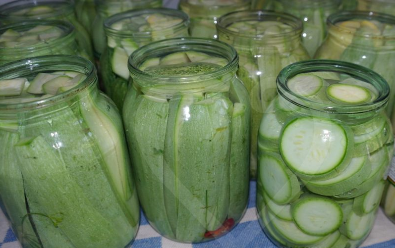 Step 5 Pour jars of hot boiled water, cover with metal lids and sterilize until the zucchini change color from green to yellow and only green streaks remain in some places.
