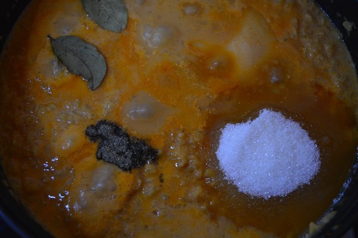 Step 2 Then add sugar, salt (1 tablespoon), black pepper, bay leaf and simmer for about 30 minutes.