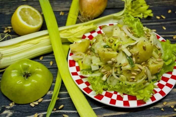 Step 6 Put the potato salad on the green leaves of the fresh salad.