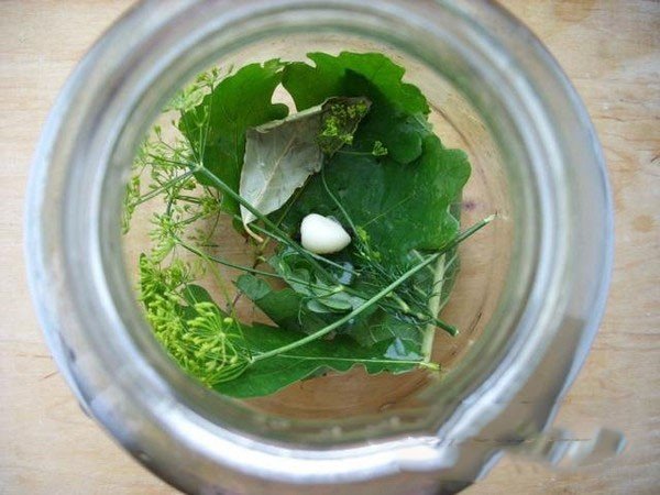 Step 3 At the bottom of each clean jar, lay the leaves of horseradish, currant and cherry, dill inflorescences, and also add spices - garlic, pepper.