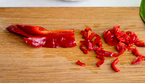 Step 4 Cut bell pepper in half, remove the stem and seeds. Cut into strips.